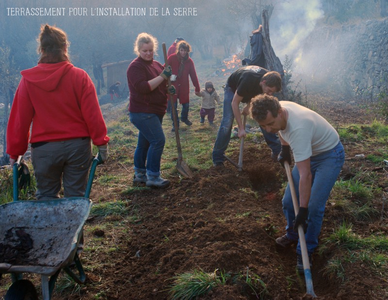 En 2013, nous avons défriché des terrasses au Sud du hameau, monté une serre, désherbé, fait un compost en tas. Début 2014, nous avons refait le toit du séchoir à plantes et de la pierre sèche.
